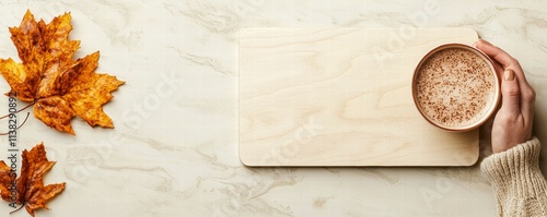hot chocolate, cocoa, autumn, fall, maple leaf, leaf, fall leaf, autumn leaf, cosy, warm, comfort, drink, beverage, hot drink, tea, mug, cup, wooden board, wood, table, marble, background, texture, topview, overhead, hand, woman's hand, sweater, beige, neutral, minimalist, simple, elegant, stylish, seasonal, october, november, december, thanksgiving, christmas, winter, relaxation, calmness, warmth, aesthetic, home, home decor