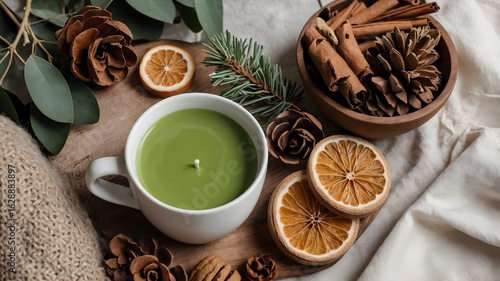 Cozy autumn themed arrangement featuring a green candle, dried citrus, pinecones, and aromatic spices.