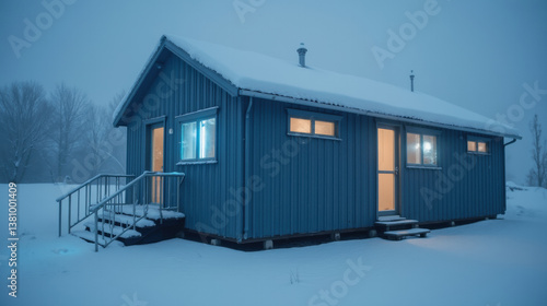 cozy blue cabin in snowy landscape, illuminated warmly from within, evokes sense of tranquility and comfort during winter nights