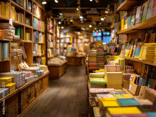 Cozy Bookstore and Stationery Shop Interior with Wooden Shelves and Warm Lighting