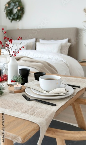 breakfast, hot drink, cosy, minimalist, decor, bedchamber, table, setting, holiday, linen, modern, tea, white, black, festive, berry, candle, wood, tableware, mug, comfortable, relaxation, interior, design, dining, home, atmosphere, calmness, greenery, nightstand, simple, aesthetic, serene, tablecloth, serving, hospitality, meal, rustic, contemporary, inviting, textured, seasonal, warmth