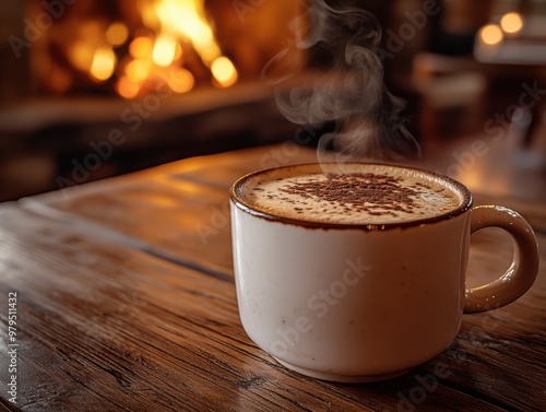 Cozy Cabin Ambiance: Steaming Cup of Coffee in Warm Glow