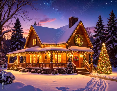 christmas, cabin, decorated, winter, snow, house, light, holiday, cosy, festive, exterior, night, tree, rustic, warm, snowy, evening