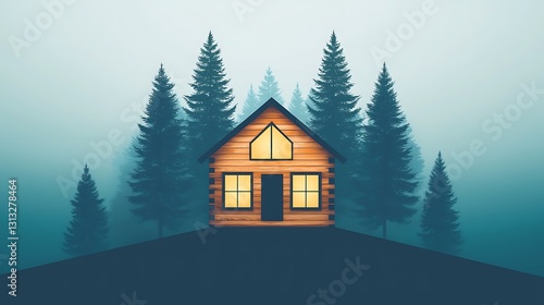 Cozy cabin escape forest clearing digital art misty environment serene viewpoint tranquility concept