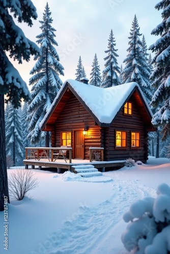 Cozy cabin exterior with snow-covered roof and pine trees, cozy cabin,