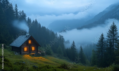 cabin, mountain, forest, mist, fog, dusk, night, landscape, nature, cosy, tree, wood, light, glow, dark, cloud, vale, hill, grass, smoke, chimney, home, house, remote, wilderness, tranquil, serene, peaceful, calm, quiet, solitude, escape, adventure, travel, vacation, holiday, alps, europa, scenic, beautiful, atmosphere, moody, dramatic, mysterious, magic, fairy tale, fantasy, dream, inspiration
