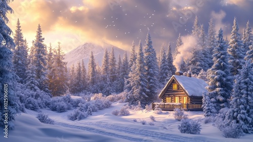 cabin, winter, snowy, forest, sunset, landscape, snow-covered, tree, wood, mountain, mountain, timberland, frost, cold, picturesque, peaceful, serene, romantic, nature, scenic, beautiful, winter landscape, christmas, holiday, travel, vacation, scenery, season, cold weather, sunrise, evening, golden hour, light, shadow, detail, texture, dreamy, magical