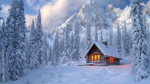 Cozy cabin in a snowy landscape surrounded by tall trees.