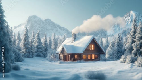 Cozy Cabin in a Snowy Mountain Forest with Smoke Rising from the Chimney