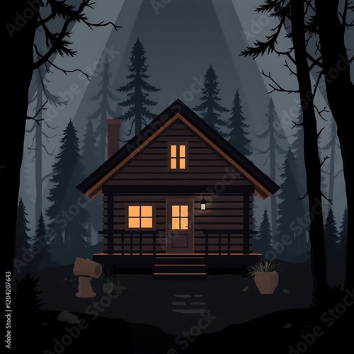 cabin, forest, wood, tree, night, dark, mountain, home, house, bungalow, wooden, log, rural, nature, landscape, scene, illustration, art, design, vector, graphic, evening, dusk, solitude, peaceful, quiet, serene, secluded, remote, wilderness, shelter, refuge, escape, get-away, calmness, mysterious, mystical, fairy tale, magical, ambience, atmosphere, outdoors