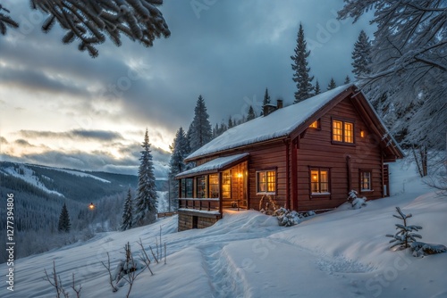 winter, cabin, snow, mountain, tree, sunset, christmas, holiday, bungalow, landscape, nature, wood, house, home, cosy, twilight, evening, cold, fir, pine, snowy, forest, illuminated, light, scenic, view, beautiful, idylli, serene, peaceful, magical, wonderland, travel, vacation, escape, relaxation, christmas tree, fireplace
