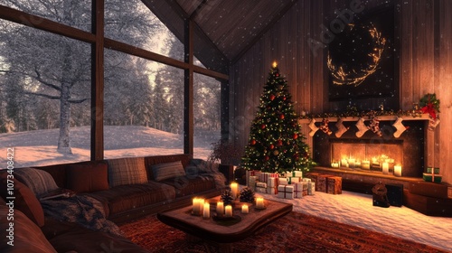Cozy Cabin Interior with Christmas Tree and Fireplace