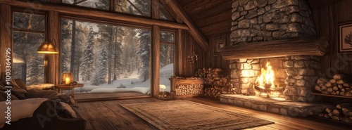 Cozy cabin living room with a stunning view of snow-covered trees and a warm fireplace, perfect for winter relaxation.