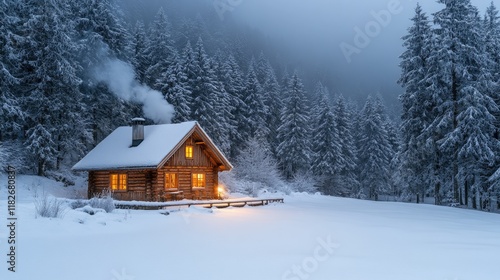 cabin, bungalow, winter, snow, forest, tree, wood, snowy, cold, landscape, nature, serene, peaceful, quiet, tranquil, magical, idylli, secluded, remote, wilderness, mountain, evergreen, pine, fir, spruce, branch, bough, illuminated, light, warm, fire, smoke, chimney, wooden, log, rustic, cosy, home, shelter, refuge, fairy tale, beautiful, scene, image, photograph, view, vista