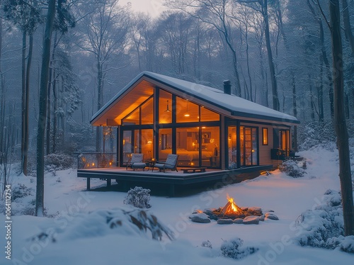 Cozy cabin nestled in snowy woodland setting with warm glow