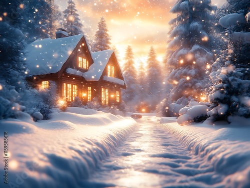 Cozy Cabin Winter Wonderland Snowy Forest Sunset