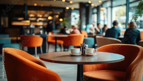 cafes, hot drink, eatery, table, chair, cup, interior, cosy, modern, stylish, design, furniture, ambience, atmosphere, relaxing, warm, inviting, comfortable, people, blurred, background, orange, brown, wood, lighting, window, city, view, building, urban, daytime, indoor, drink, breakfast, meeting, social, gathering, place, setting, spot