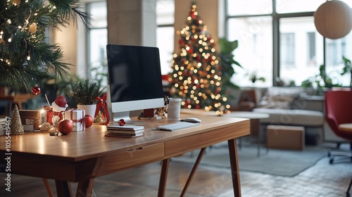 Cozy christmas atmosphere in a modern office with a decorated desk and christmas tree