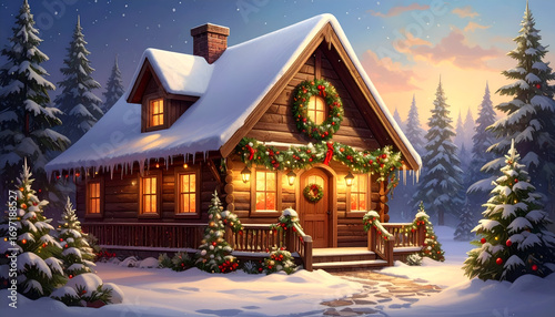 cabin, christmas, winter, snow, holiday, festive, chaplet, decoration, cosy, evening, light, pine tree, snowfall, winter landscape, seasonal, nature, peaceful, tranquil, snowy, rustic, retreat, outdoors, celebration, chimney, wood house, scenic