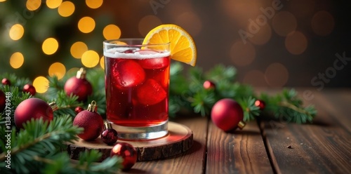 Cozy Christmas drink scene with festive ornaments and garland, snowflakes , Christmas decorations