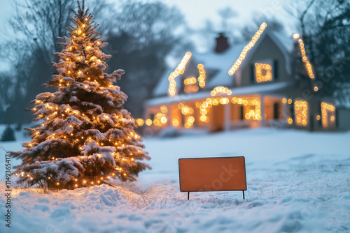 Cozy Christmas house decorated for the holidays with glowing lights. Snowy landscape. Christmas tree adorned with lights. For sale sign. Winter scene. Real estate opportunity. Holiday atmosphere.