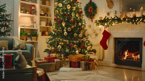 christmas, living, room, tree, decorated, ornament, colourful, fireplace, stocking, cosy, festive, glow, ambient, celebration, family, holiday, joy, season, winter, warmth, comfort, cheer, sparkle, decoration, occasion, christmas, merriment, hearth, home, tradition, light, santa, reindeer, gift, candy, cookie, star, chaplet, snowflake, elf, angel