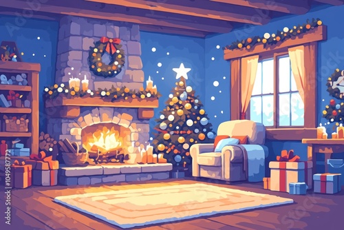 christmas, living room, fireplace, decorated, tree, present, winter, cosy, holiday, home, illustration, festive, light, ornament, snow, armchair, fire, warm, cheerful, happy, magical, family, gathering, celebration, tradition, season, december, joy, peace, love, christmas spirit, winter landscape, merry christmas, happy holiday, christmas eve, christmas decoration, christmas lights, christmas gift