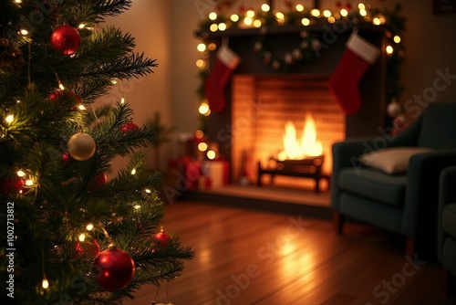 Cozy christmas living room with fireplace and decorated tree ambience. Christmas card with a cozy atmosphere and space for text.