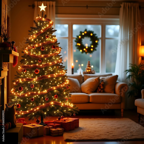 christmas tree, christmas, holiday, festive, cosy, warm, living room, home, interior design, decorated, light, ornament, red, gold, christmas decoration, christmas lights, holiday spirit, present, gift, fireplace, couch, sofa, window, chaplet, family, winter, calm, peace, celebration, illuminated, soft focus, detailed, home decor, holiday season, seasonal, interior, festive season, christmas spirit, christmas eve, decor, lighting, warm colors, rustic