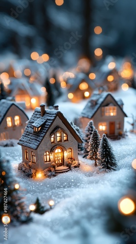 Cozy Christmas village with warm glowing lights and snowy rooftops