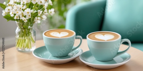 Cozy coffee date with two cups of latte art and fresh flowers in a bright, inviting cafe setting