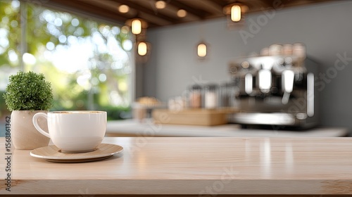 Cozy Coffee Shop Interior with a Cup on a Wooden Countertop