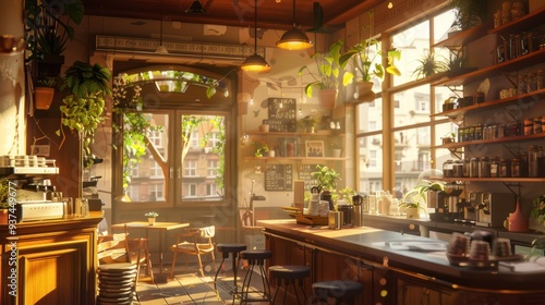 cafes, hot drink, shop, interior, window, sunlight, sunny, bright, wood, table, chair, bar, counter, plant, green, pot, shelf, glasses, jar, machine, cup, glassware, cosy, warm, rustic, vintage, light, natural, daylight, morning, afternoon, day, city, urban, street, view, building, atmosphere, ambience, charming