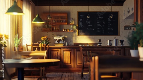 Cozy Coffee Shop Interior with Warm Lighting and Rustic Ambiance