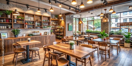 Cozy coffee shop interior with wooden tables and comfortable chairs, coffee shop, decoration, warm, furniture, relaxation