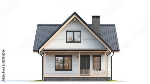 Cozy Cottage Exterior: A charming single-story house with a grey metal roof, white siding, and dark window frames sits on a small patch of grass. The design is simple yet inviting.