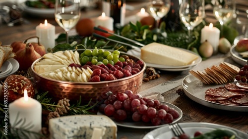 Cozy, elegant dining table featuring a copper fondue pot, gourmet cheeses, fresh fruits, and elegant tableware, ambient candlelight creating a warm, inviting atmosphere