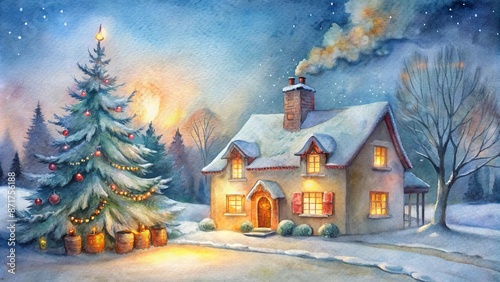 Cozy English countryside house adorned with festive decorations, Christmas tree, and crackling fireplace, evoking warm winter holiday ambiance.
