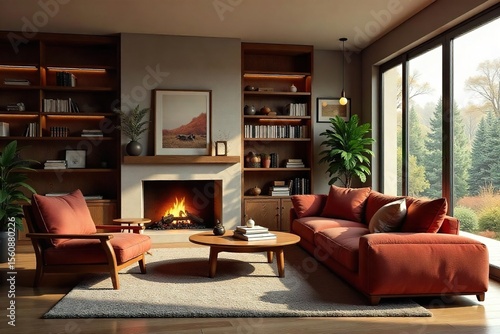 Cozy Family Room Interior Warm Lighting, Fireplace, and Comfortable Furniture Perfect for Relaxation and Family Time