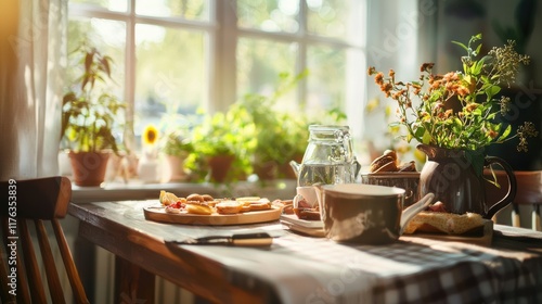 kitchen, home, table, food, baking, breakfast, cooking, dining, interior, window, sunlight, flower, plant, lifestyle, rustic, cosy, warm, natural, homemade, delicious, pastry, bread, jar, bottle, ceramic, wood, still life, calming, peaceful, comfy, homely, domestic, culinary, cookery, bake, prepare, meal, dine, relax, unwind, snack, enjoy, nourish, nurture, savour, sustain, organic, artisanal