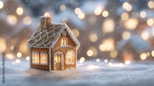 cozy gingerbread house glowing in snowy winter wonderland scene with sparkling festive soft bokeh lights
