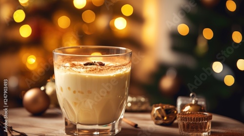 Cozy holiday: aromatic eggnog with cinnamon against festive Christmas lights