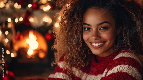 happy woman, missy, curly hair, red sweater, fire, fireplace, christmas tree, ornament, holiday spirit, christmas decoration, festive, joy, warmth, togetherness, celebration, winter, indoor, smiling, love, happiness, embracing, seasonal, cheerful, holiday season, decoration, gift, relaxing, tradition, home, joyful, vivid colors, candid, lifestyle, moment, comfort, family time