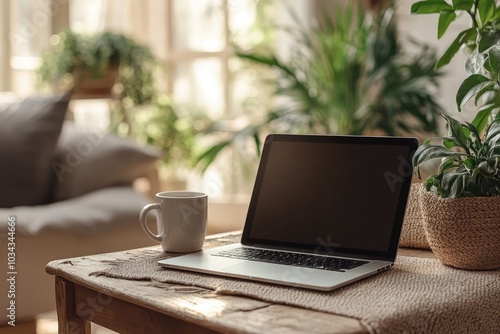 cosy, home, office, laptop, hot drink, plant, workspace, interior, decor, sunlight, relaxation, productivity, greenery, modern, wooden, table, comfortable, bright, nature, serene, minimal, design, aesthetic, peaceful, environment, technology, work, calm, desktop, beverage, foliage, living, space, setup, remote, job, freelance, atmosphere, stylish, natural, organic, homelike, calmness, sharpened