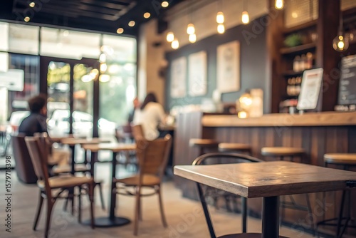 Cozy indoor coffee shop setting with wooden furniture and warm lighting ambiance