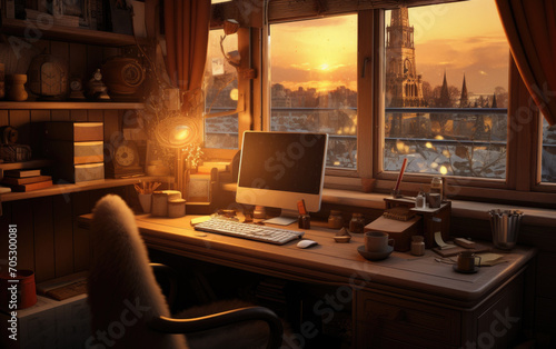 contemporary, home, office, minimalistic, decor, wooden, desk, large, window, potted, plant, nature, modern, minimal, wood, interior, simple, natural, design, work, space, bright, clean, functional, comfortable, aesthetic, minimalist, cosy, green, stylish, computer, sunlit, organised, naturalistic, serene, warm, inviting, ai, generative, illustration, digital, art
