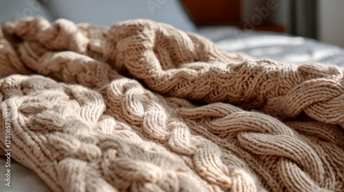 Cozy knitted wool blanket with chunky cable pattern in warm beige tones