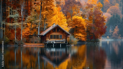 Cozy Lakeside Cabin Surrounded by Vibrant Autumn Foliage Reflecting in Calm Waters