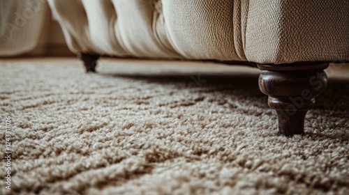 Cozy living room corner with a plush rug and vintage couch legs in warm lighting