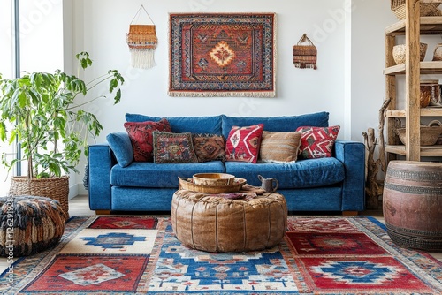 Cozy living room featuring a blue sofa, colorful textiles, and unique decor elements in a modern home